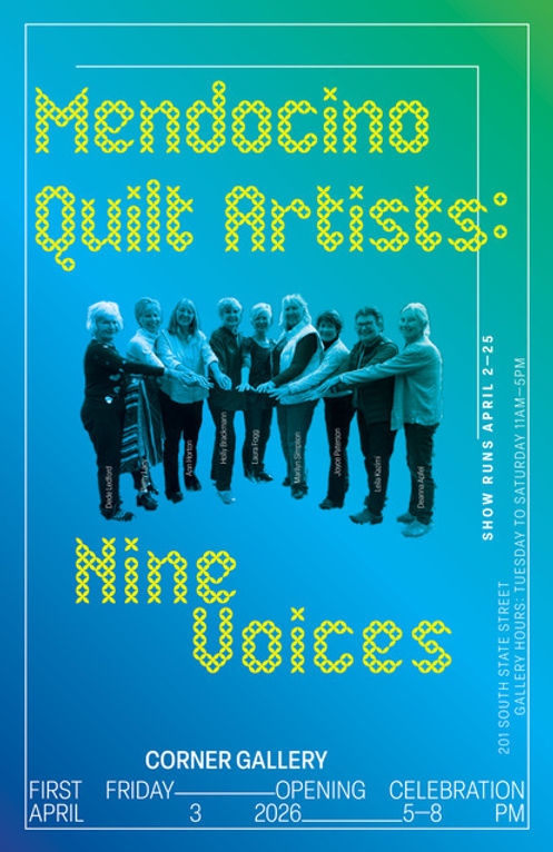 Mendocino Quilt Artists (MQA) is a nationally known group of nine creative women united by a shared love of art and quilting. For over thirty years, they have met twice a month in each others’ homes to share their art and inspire/support each other. They also gather biannually for multi-day quilt retreats in Philo and on the Mendocino coast. While their many passions include music, dance, nature, travel, books, family and food, quilting is the main thread that continues to weave their busy lives together. Through their artwork, they celebrate life’s richness and honor their deep connection to inland Mendocino County and the vibrant community that inspires and sustains them.